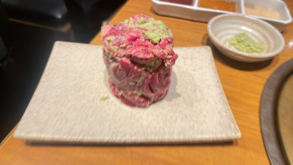 見た目ほど辛くなく、お肉の濃厚な脂とわさびの清涼感がとてもマッチしています